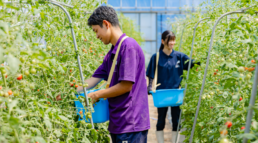 ミニトマト、アスパラガス、トマト、キュウリ、メロン、イチゴなどの生産計画を学生自らが立てて栽培に取り組んでいます。資材類の選定をはじめ、播種から収穫・調製までを一貫管理することで、早期の技術習得が可能です。また、環境制御機器や養液栽培技術を活用した高度な野菜栽培も学ぶことができます。