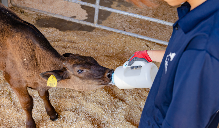 肉用牛専攻では、毎年15頭程度の子牛が誕生します。分娩後すぐに母牛は子牛を舐め、子牛は出生後しばらくすると自力で立って母牛の乳を飲もうとします。学生たちは、毎日の実習で細かな飼育管理、牛の健康状態の確認等を行い発育良好な牛となるよう奮闘中です。