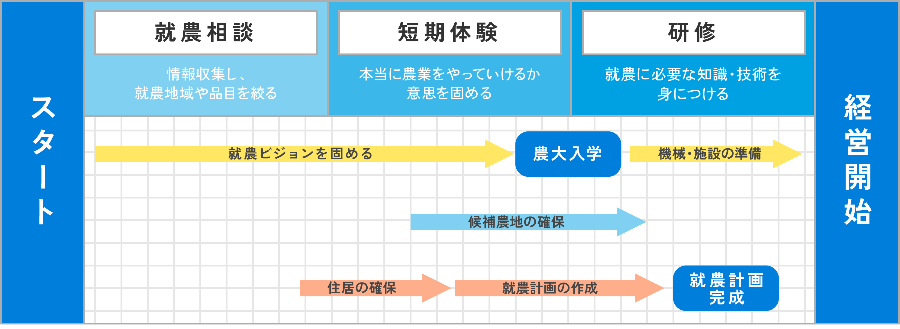 そのため、事前に就農支援担当者等と相談を重ねて就農予定地を決め、卒業後の就農ビジョン(経営作目や就農予定時期等)や就農までの準備等の道筋を明確にした上で入学します。就農予定地は、各市町村で作成されている「就農パッケージ」を参考に、研修内容や農地・住居の確保・目指す経営モデル等、就農までの過程や就農後の姿を具体化させながら検討を進めていきます。
